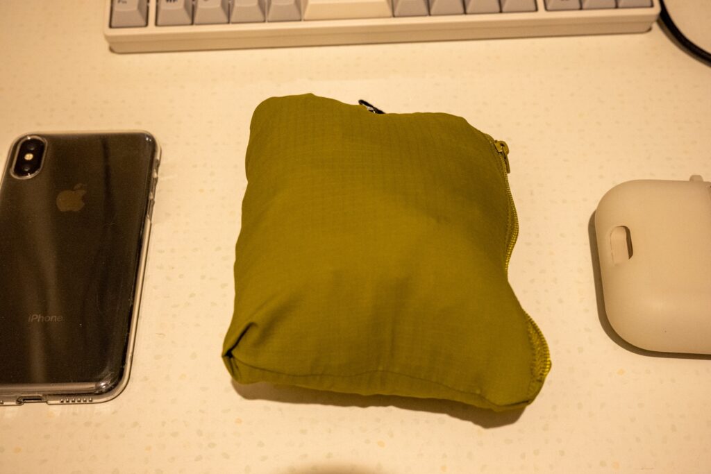 胸ポケットに押し込めば、このサイズまで収納できる。重さは約140g。まさにポケッタブルジャケット。登山用の服の高機能にはいつも驚かされる。