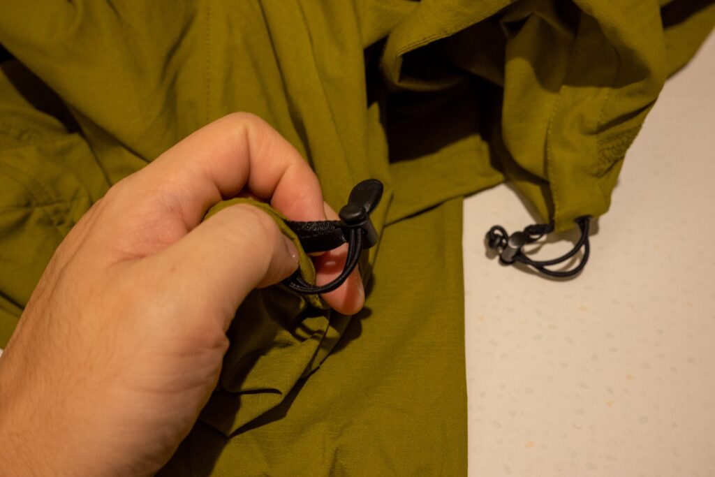 防水ではないがある程度の撥水処理がしてあるらしいので、小雨程度なら大丈夫そう。登山だけではなく自転車乗る時のアウターとしても良さそうである。絞りもあるしフード部分はちゃんとしっかり補強されている。