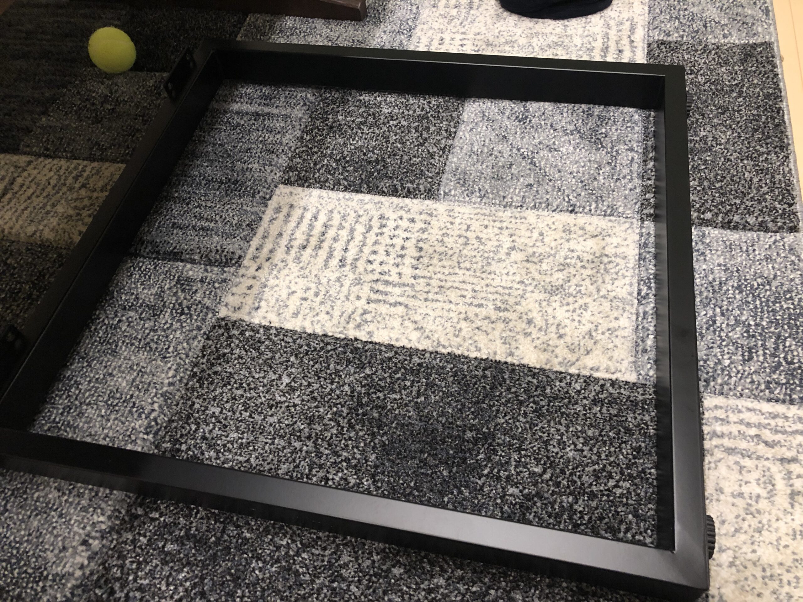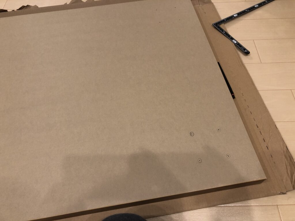 まず天板を裏返しにして脚を取り付ける場所を決める。今回は横は5cm、前後は1cm(天板が65cmで脚が63cmなので)のところに取り付けるイメージ。天板が重たいのでギックリ腰にならないように注意しないといけない。