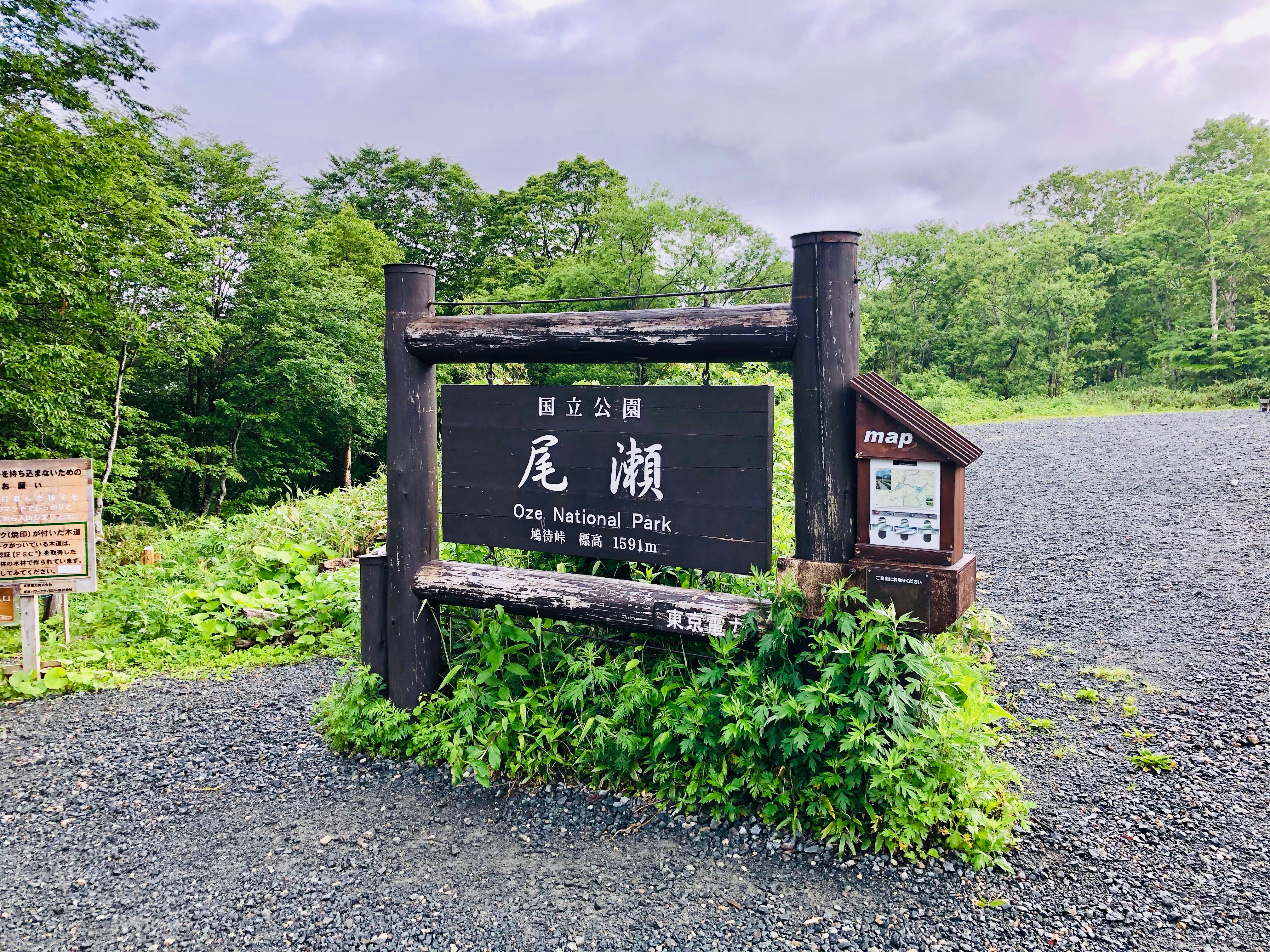 深夜1時頃に到着すると駐車場は3分の1くらい埋まっていた。到着する頃には死ぬほど疲れていたのであっという間に就寝。6時頃起床すると駐車場はかなり埋まっていた。尾瀬の入り口である鳩待峠までは乗り合いタクシーで980円。20分くらい山道を揺られて登山道に入る。予報は雨だが三連休ということでまぁまぁ人多い。