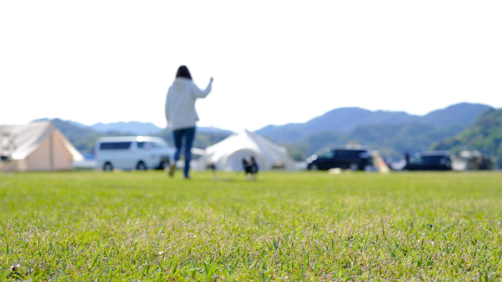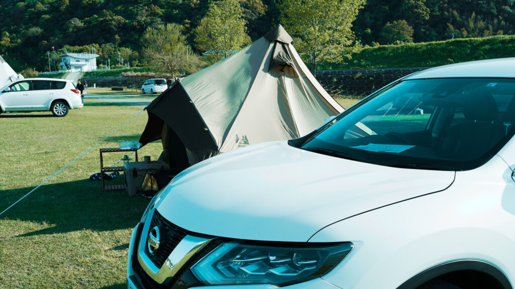 この日は日曜日だったが、流石笠置キャンプ場…中々混んでる。ツインクレスタのサイズ感がいまいちわからなかったので、なるべく広めのスペースが確保できるところを選んでエクストレイルを止めた。