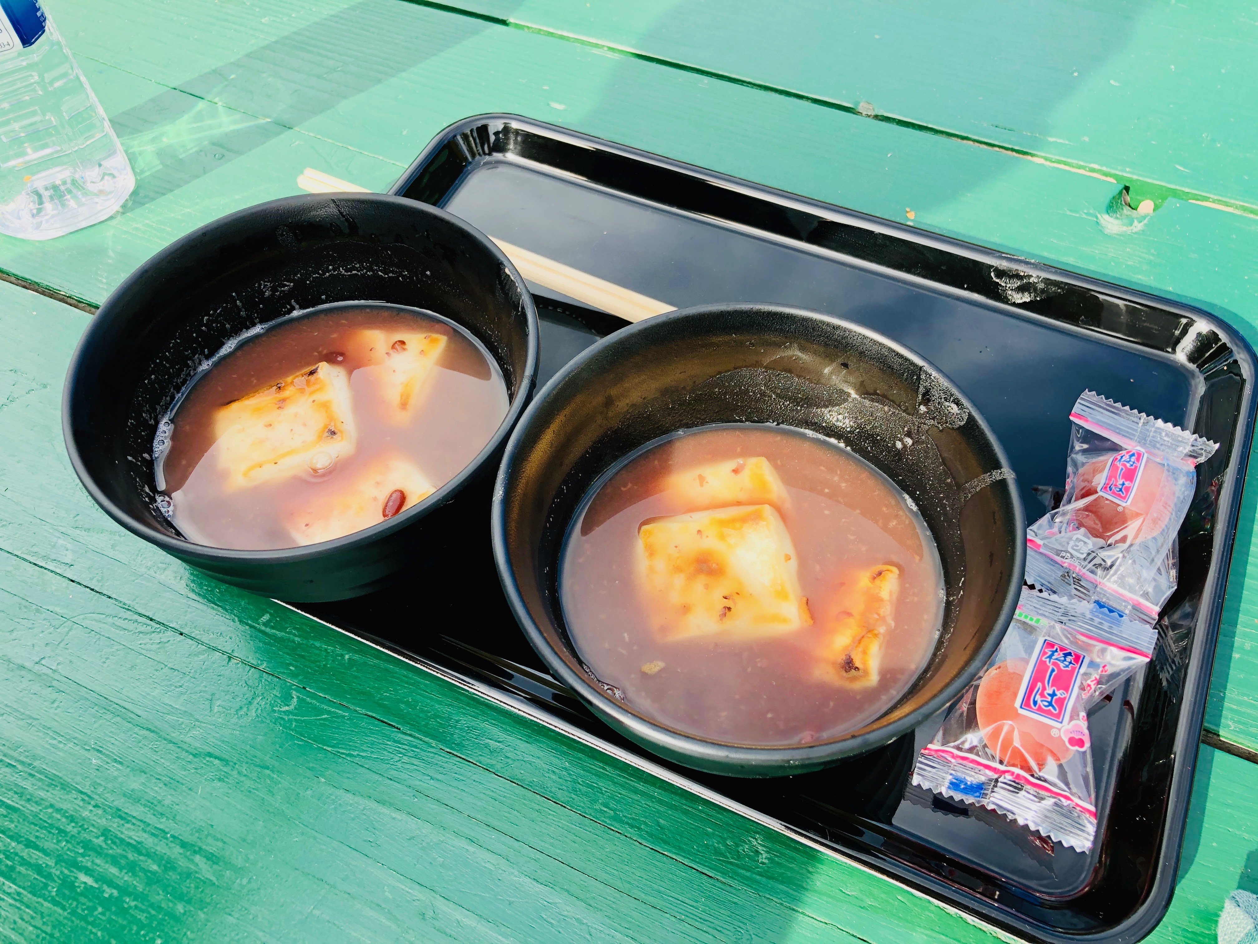 夏はスイカが有名らしいが流石に季節が外れており、おしるこに。山で食う飯はまぁ、どれもうまい。トイレもこの先ないのでここですましておく。