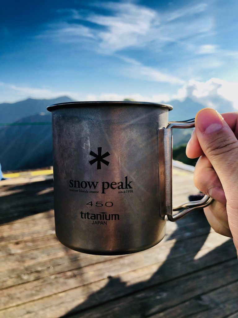 カレーを食べた後はコーヒーを淹れ、一服。なんだかんだスノーピークのチタンマグはかっちょいい…まだまだ時間があるので、このまま燕岳頂上へ。